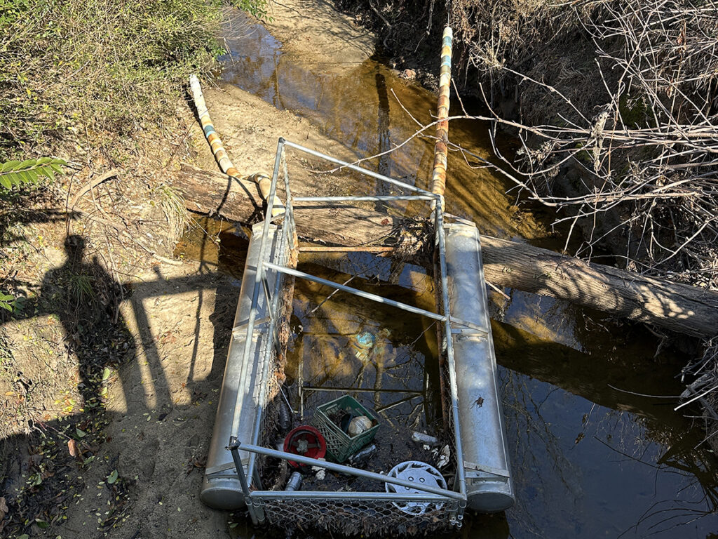 “They were learning about the Wetland Center, and the Wetland Center was talking about the trash trap, and brought them down to have a look,” Clay said. “We had an impromptu presentation about the trap while we were in the creek, and the good news is, some of those folks said they’d be interested in adopting it.”