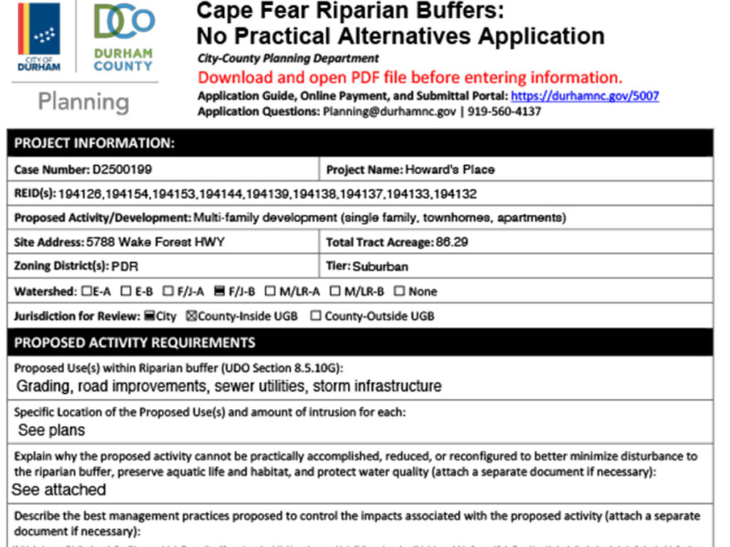 “Essentially, it is a process where developers can apply to impact streams, vegetative, Riparian buffers and other natural resources that would otherwise not be allowed to be impacted according to Durham statute,” she said. “The problem is — and it’s a major problem — this NPAA process happens behind closed doors, without any public notification and does not require approval by Durham’s elected officials.”