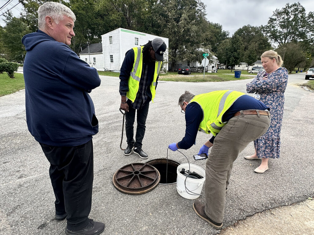 On Tuesday, Samantha joined NCDEQ Division of Water Resources Environmental Program Consultant Donald Smith, Smithfield Public Works Director Lawrence Davis, Smithfield Public Utilities Director Ted Credle and Assistant Town Manager Kimberly Pickett to collect samples at the outfall itself, at a manhole at the intersection of Bridge and Fifth streets and on the property of the Lamphe & Malphrus lumber mill.