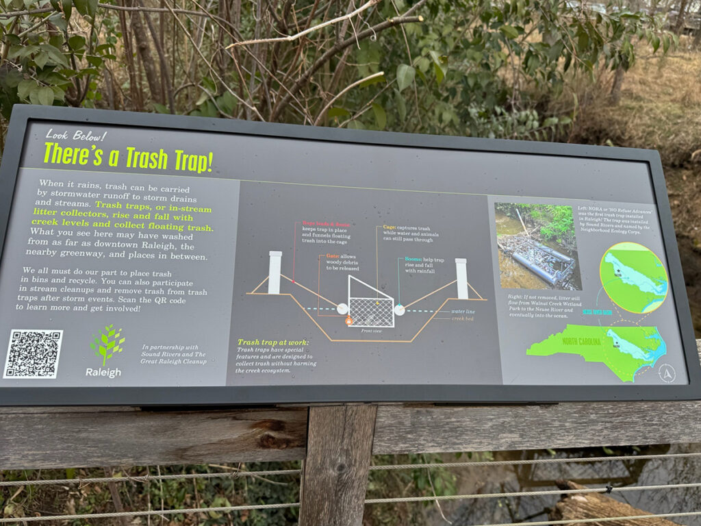 The City of Raleigh celebrated its Litter-Free Rivers partnership with Sound Rivers by recently installing a new, educational sign at the Walnut Creek Wetland Center trash trap on Little Rock Creek. Next up: the installation of Trash Trap No. 14 on Spring Branch in Smithfield!