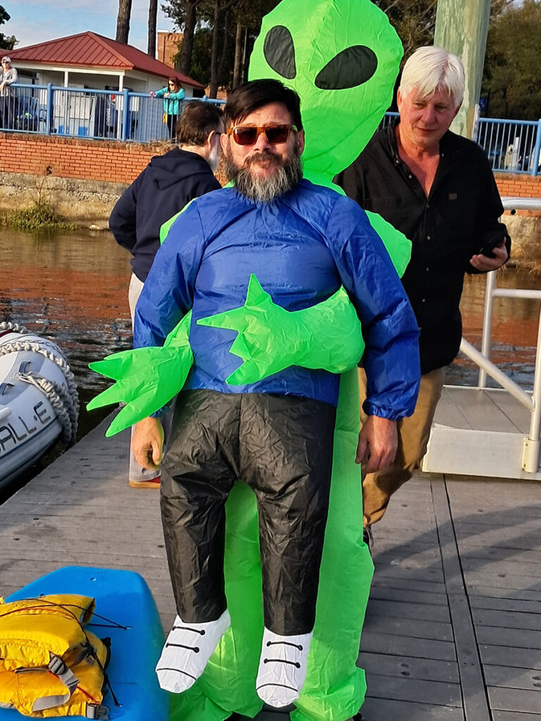 After the paddle, the “coven” went to Pitt Street Brewing on the Pamlico to announce the winners of the on-the-water costume contest. Judges Laura Scoble, of Backwater Jack’s Tiki Bar and Grill, and Scott Campbell, of Coldwell Banker Coastal Rivers Realty, announce the winners.